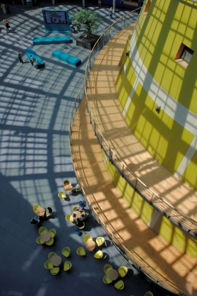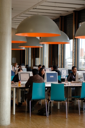 De entree van de Bibliotheek op de eerste verdieping is ook aan het Plein komen te liggen. Studenten komen er binnen via een groot studielandschap. Hier zijn computerwerkplekken en informele overlegplekken gemaakt langs een transparante glaswand grenzend aan het Atrium. De sfeer van de inrichting en uitstraling in het project ‘Plein+’ zijn divers als een afspiegeling van de vele kleurrijke culturen binnen De Haagse Hogeschool. Het hierop gebaseerde kleurplan is ontstaan uit een mix van mediterrane kleuren: het groengeel van citroenen, grijsbruin van peperkorrels, azuurblauw van de Middellandse Zee en paarsblauw van de druif. Met een diversiteit aan allerlei soorten verblijfsplekken is een warme eigentijdse sfeer ontstaan. “Van doorgangsgebied naar kloppend hart van de hogeschool. Door de metamorfose is het een levendig, bruisend plein geworden, zoals wij het voor ogen hadden.” Annelies van Rosmalen, director marketing & communications, De Haagse Hogeschool |