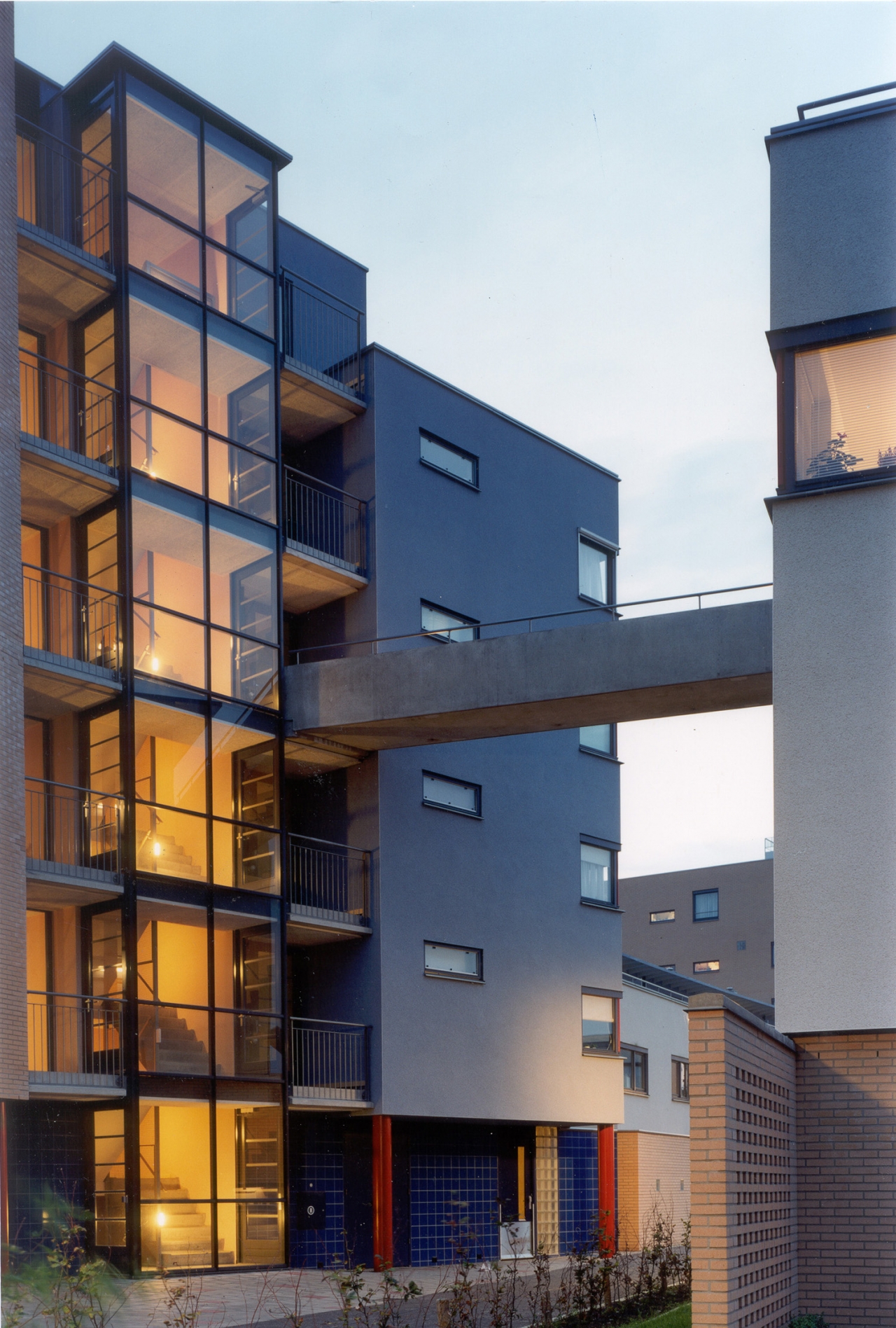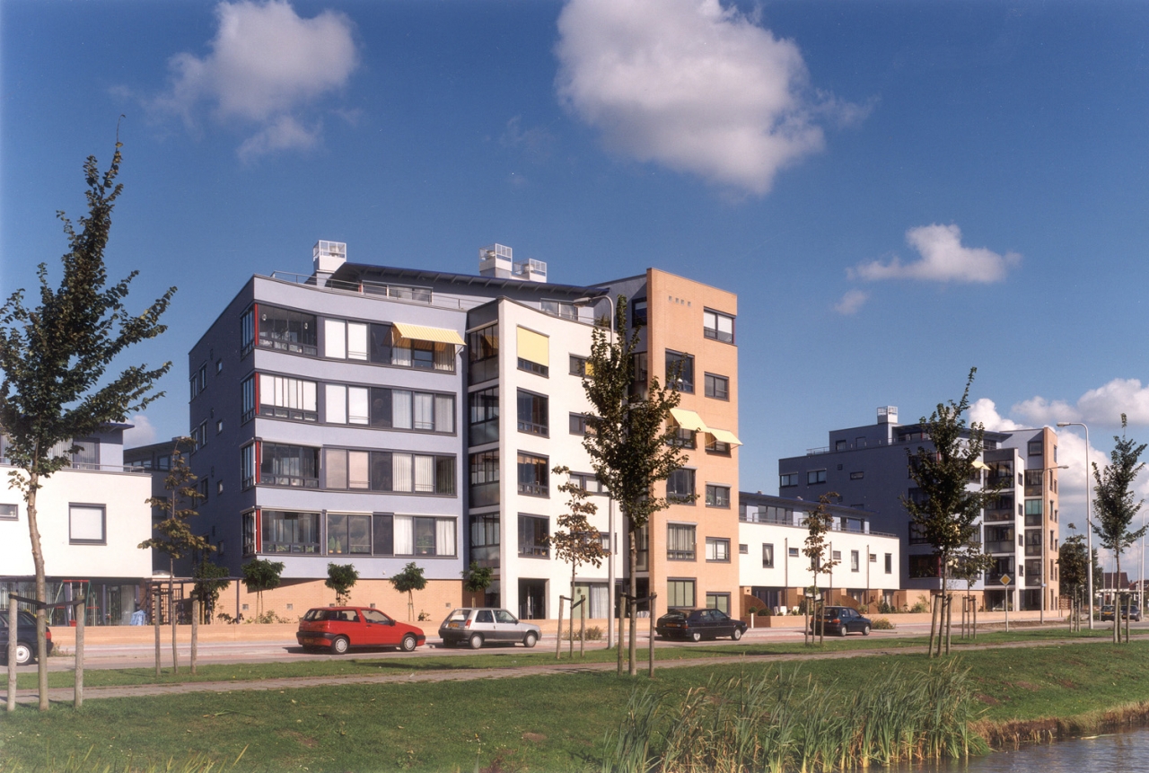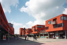 Luifels en straatinrichtingselementen maken het plein tot een aangename ruimte. Voor de woningen is het thema wonen in verscheidenheid. Zo kun je statig wonen in de Crescent, beschut wonen aan de ronde bomenlaan, wonen in stadsvilla’s boven winkels, in woningen met een soort serre aan het parkeerdek.Verscheidenheid ook tijdens een wandeling door de wijk. Lopend door de wijk wordt je beleving voortdurend geprikkeld, zonder een overdaad te zijn. Geprikkeld door: richtingsverdraaiingen, de afwisseling van lanen/straten/stegen, repetitie versus accenten, textuurcontrasten van ruwere bakstenen & gladder stucwerk, warme & koelere tinten stucwerk, trappen als zelfstandige, architectonische elementen, loopbruggen en een trappenhuis dat ‘s avonds ‘opgloeit’… |